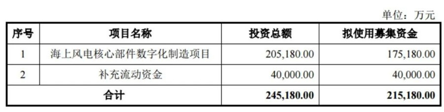 12月12日,金雷科技股份公司(簡(jiǎn)稱“金雷股份”)發(fā)布《向特定對(duì)象發(fā)行股票募集說(shuō)明書》(修訂稿),擬募集資金21.52億元,用于海上風(fēng)電核心部件數(shù)字化制造項(xiàng)目(17.52億元)和補(bǔ)充流動(dòng)資金(4億元)。