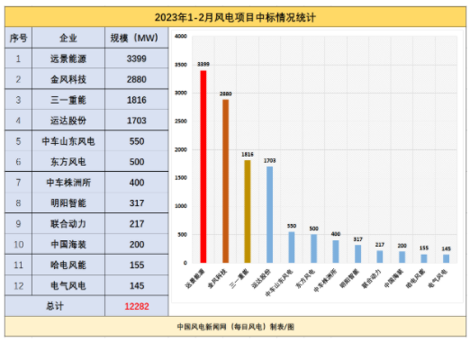 其中,遠景能源、金風科技和三一重能中標規(guī)模名列前三名,分別為3399MW、2880MW、1816MW,占比分別為27.67%、23.45%和14.79%。