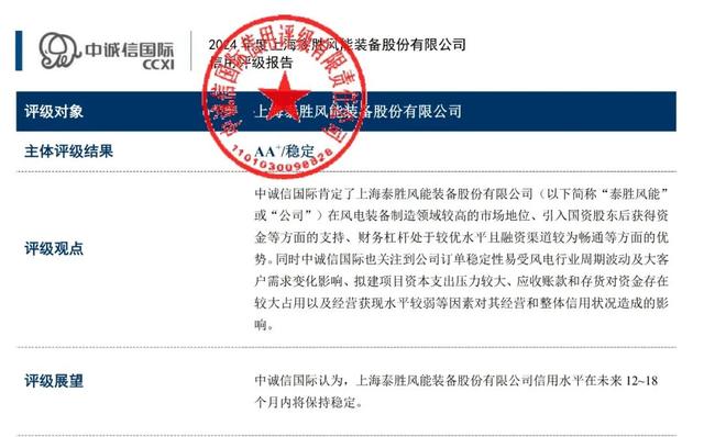 近日,上海泰勝風(fēng)能裝備股份有限公司(以下簡(jiǎn)稱“泰勝風(fēng)能”)經(jīng)中誠(chéng)信國(guó)際信用評(píng)級(jí)有限責(zé)任公司(以下簡(jiǎn)稱“中誠(chéng)信”)嚴(yán)格評(píng)審,被授予主體信用等級(jí)“AA+”,評(píng)級(jí)展望穩(wěn)定,成為風(fēng)電行業(yè)風(fēng)電支撐結(jié)構(gòu)第一家“AA+”企業(yè)。