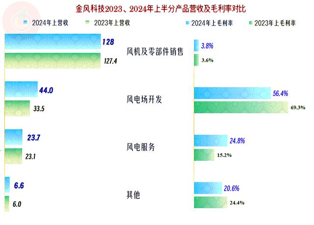 2024年上半年,金風(fēng)科技核心的“風(fēng)機(jī)及零部件銷售”業(yè)務(wù)毛利率小幅增長,但總體水平仍然很低;“風(fēng)電場開發(fā)”業(yè)務(wù)的毛利率雖然大幅下降,但仍然超過了五成;“風(fēng)電服務(wù)”業(yè)務(wù)的毛利率有較大幅度增長,對平均毛利率的提升起到了不小的作用。
