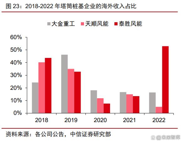 國(guó)內(nèi)企業(yè)塔筒出海勢(shì)頭加速,單樁出口實(shí)現(xiàn)突破。大金重工、天順風(fēng)能、泰勝風(fēng)能的 出口比例接近,國(guó)內(nèi)企業(yè)以出口塔筒產(chǎn)品為主,海外客戶的供應(yīng)商體制使有出口業(yè)績(jī)的公 司具備更好的客戶端優(yōu)勢(shì);樁基因運(yùn)輸效率低和方案不成熟的問(wèn)題,需求仍主要由海外本 地產(chǎn)能滿足。根據(jù)大金重工公告,公司憑其基礎(chǔ)設(shè)施、港口條件和工藝裝備和對(duì)海外業(yè)務(wù) 的加大投入,于 2022 年攬入 6 項(xiàng)海風(fēng)海外項(xiàng)目,包括 5 項(xiàng)歐洲項(xiàng)目,成為國(guó)內(nèi)首家管樁 產(chǎn)品出口歐洲的企業(yè),打開(kāi)國(guó)產(chǎn)樁基的歐洲市場(chǎng)。