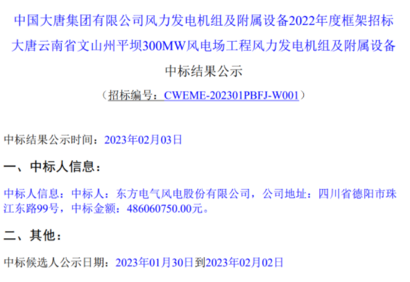 公告顯示,東方電氣風(fēng)電股份有限公司成功中標(biāo)該項目,中標(biāo)價格為486060750.00元。