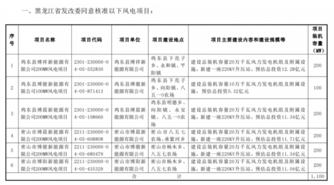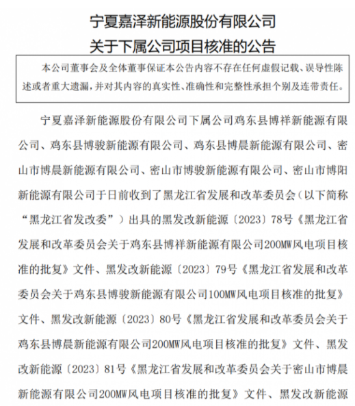 公告披露,寧夏嘉澤新能源股份有限公司下屬公司于日前收到了黑龍江省發(fā)展和改革委員會(huì)(以下簡稱“黑龍江省發(fā)改委”)出具的風(fēng)電項(xiàng)目核準(zhǔn)的批復(fù)文件,共計(jì)六個(gè)風(fēng)電項(xiàng)目獲得核準(zhǔn),總裝機(jī)容量為1100MW。