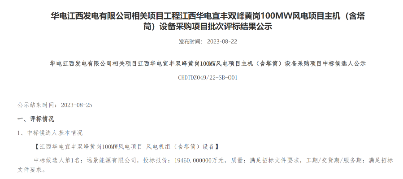 公告顯示,第一中標候選人:遠景能源有限公司,投標報價: 19460.000000萬元。第二中標候選人:明陽智慧能源集團股份公司,投標報價。19800,000000萬元。