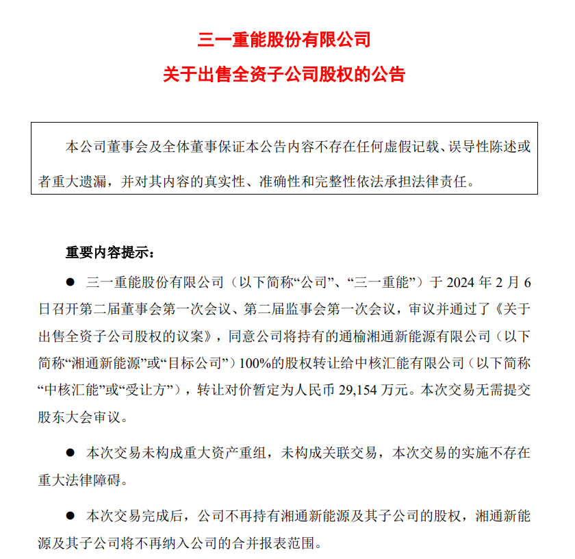 公告披露,公司將持有的通榆湘通新能源有限公司(簡稱“湘通新能源”)100%的股權(quán)轉(zhuǎn)讓給中核匯能有限公司,轉(zhuǎn)讓對價暫定為2.92億元。