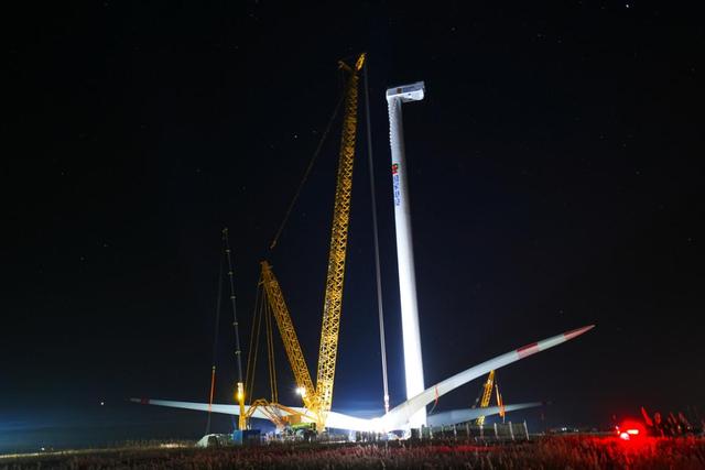 施工過程中,項目團隊充分發(fā)揮“嚴、細、實”的工作作風,時刻關注天氣變化,克服了本年度首輪寒潮和大雪的影響,緊密協(xié)同、高效配合,通過科學施工組織、周密作業(yè)準備、嚴格質量檢驗,機艙和葉輪在連續(xù)施工40小時后成功對接,圓滿完成首臺風機吊裝作業(yè)。