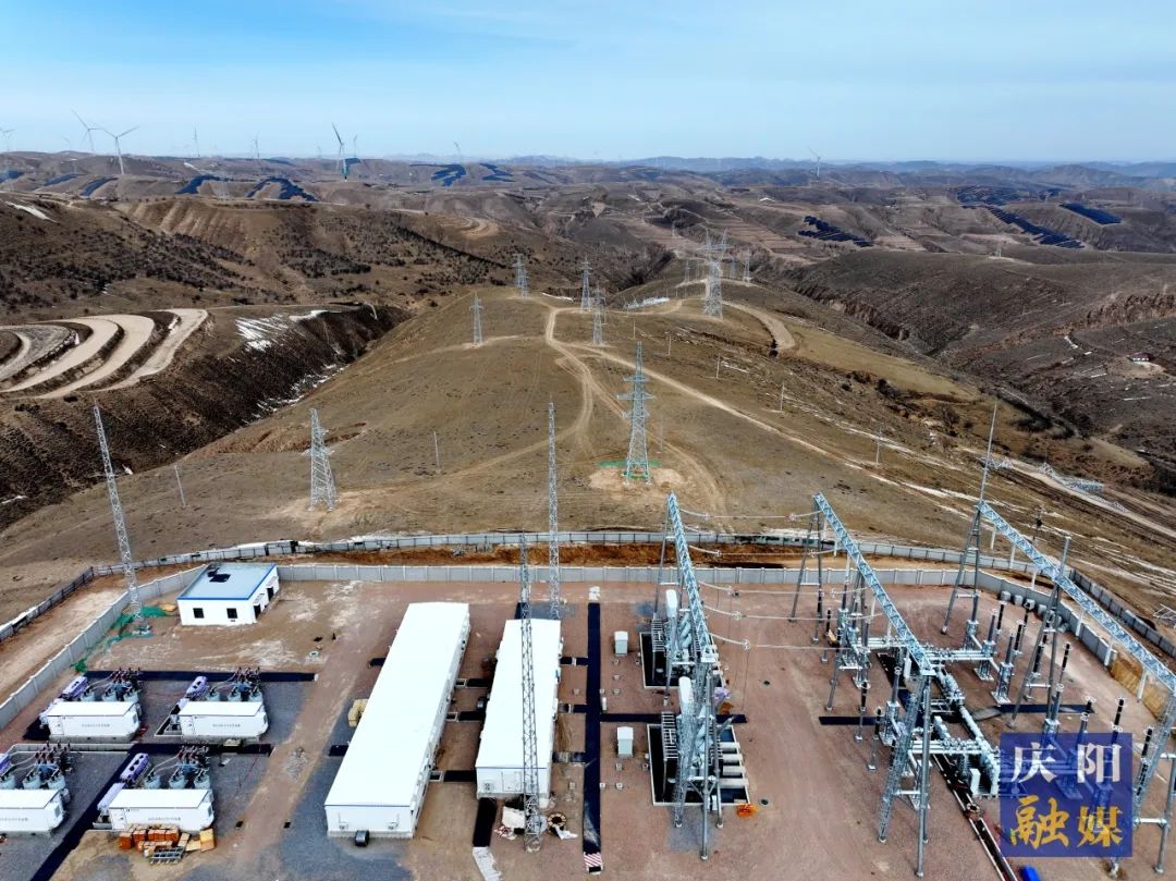 慶陽(yáng)市環(huán)縣小南溝鄉(xiāng)拍攝的華能慶陽(yáng)600萬(wàn)千瓦風(fēng)光綜合新能源示范項(xiàng)目C1升壓站工程(2月14日攝)。