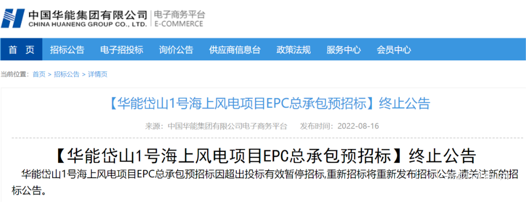 8月16日,華能集團(tuán)發(fā)布公告稱,因超出投標(biāo)有效期,決定終止華能岱山1號海上風(fēng)電項目EPC總承包預(yù)招標(biāo)項目。