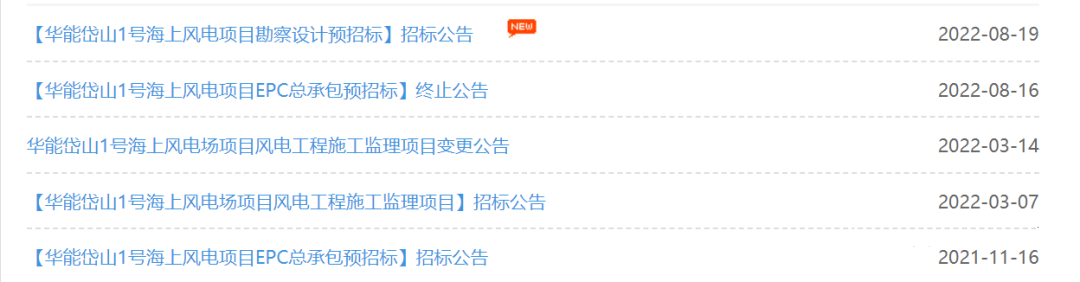 從華能電子商務(wù)平臺獲悉,《華能岱山1號海上風(fēng)電項目EPC總承包預(yù)招標(biāo)項目》于2021年11月16日發(fā)布招標(biāo)公告。截止8月16日發(fā)布終止公告之日,已耗時近一年之久。