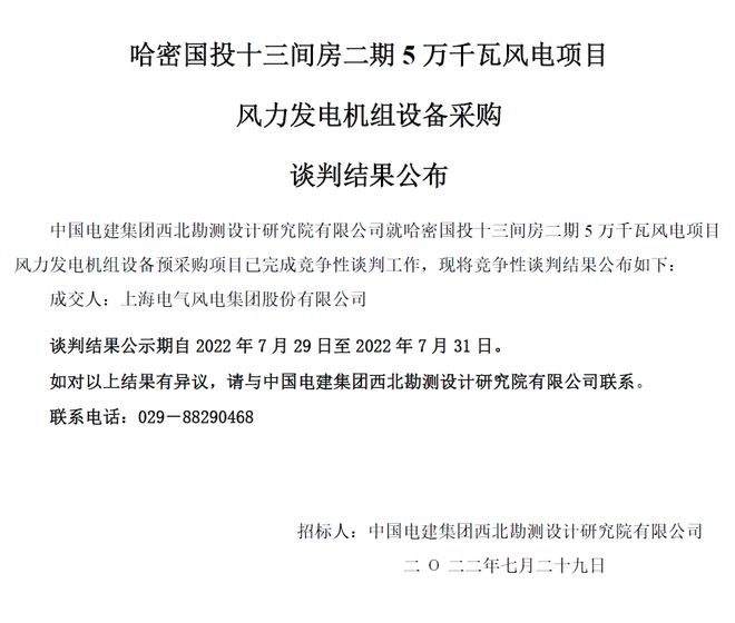 10月20日,中國電建西北院哈密國投十三間房二期5萬千瓦風(fēng)電項目風(fēng)力發(fā)電機組設(shè)備采購項目入圍公示,電氣風(fēng)電中標。