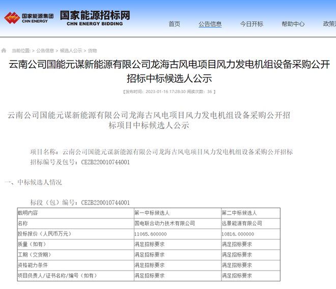 1月16日,云南公司國能元謀新能源有限公司龍海古風電項目風力發(fā)電機組設備采購公開招標中標候選人公示,規(guī)模共計52MW,國電聯(lián)合動力預中標,投標報價11065.6萬元。
