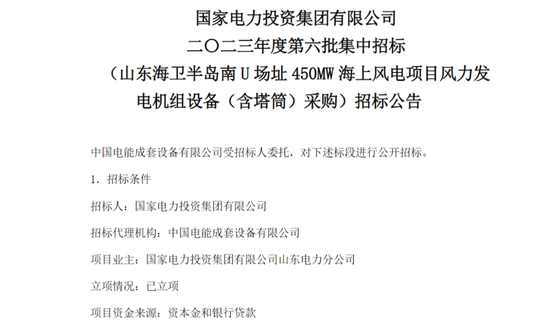 近日,國(guó)家電投發(fā)布《國(guó)家電力投資集團(tuán)有限公司二〇二三年度第六批集中招標(biāo)(山東海衛(wèi)半島南 U場(chǎng)址 450MW海上風(fēng)電項(xiàng)目風(fēng)力發(fā)電機(jī)組設(shè)備(含塔筒)采購(gòu))招標(biāo)公告》。