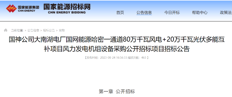 公告顯示,國網(wǎng)能源哈密一通道80萬千瓦風(fēng)電+20萬千瓦光伏多能互補(bǔ)項(xiàng)目場址位于新疆哈密大南湖地區(qū),工程場址中心距哈密市直線距離約96km,呈不規(guī)則多邊形,占地面積約165.05km²,風(fēng)電場擬安裝128臺6.25MW風(fēng)力發(fā)電機(jī)組,總裝機(jī)容量800MW,共分為兩個(gè)標(biāo)段:A標(biāo)段400MW,B標(biāo)段400MW。本項(xiàng)目計(jì)劃于2023年9月30日前開工(暫定);2024年6月30日前全容量并網(wǎng)發(fā)電。(暫定)
