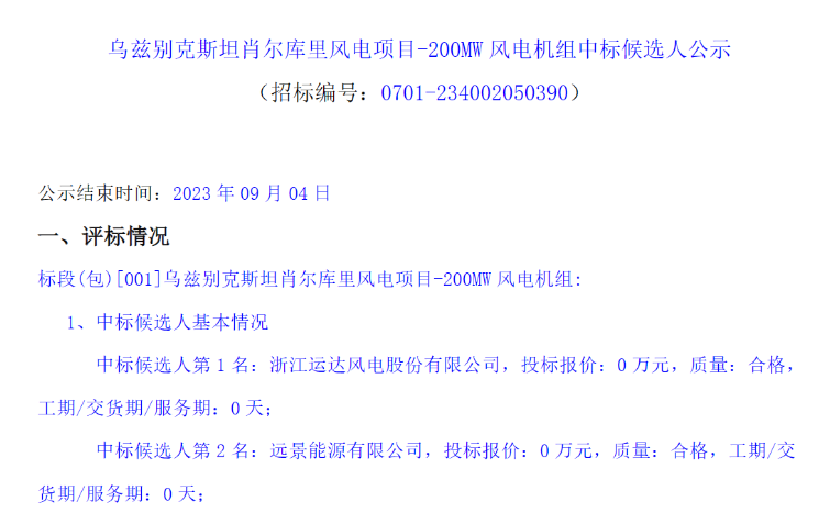公告顯示,第一中標(biāo)候選人:浙江運達(dá)風(fēng)電股份有限公司。第二中標(biāo)候選人:遠(yuǎn)景能源有限公司。第三中標(biāo)候選人:中車株洲電力機車研究所有限公司。