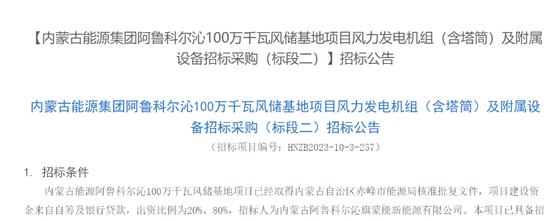 公告顯示,內(nèi)蒙古能源集團阿魯科爾沁100萬千瓦風儲基地項目位于赤峰市阿魯科爾沁旗天山鎮(zhèn)、天山口鎮(zhèn)、巴拉奇如德蘇木,總裝機容量100萬千瓦,擬采用100臺單機容量10MW風力發(fā)電機組。該項目計劃2023年12月05日開工建設,2024年12月31日全容量并網(wǎng)。