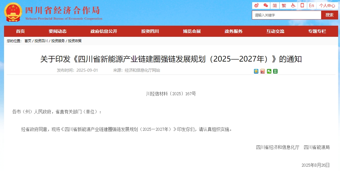 近日,四川省經(jīng)濟(jì)和信息化廳聯(lián)合省能源局印發(fā)《四川省新能源產(chǎn)業(yè)鏈建圈強(qiáng)鏈發(fā)展規(guī)劃(2025—2027年)》(以下簡稱《規(guī)劃》)?!兑?guī)劃》聚焦光伏、風(fēng)電、氫能、新型儲能等重點領(lǐng)域的產(chǎn)業(yè)發(fā)展綜合實力提升,提出到2027年,四川省新能源產(chǎn)業(yè)鏈營業(yè)收入超過5000億元,力爭達(dá)到6000億元的發(fā)展目標(biāo)。
