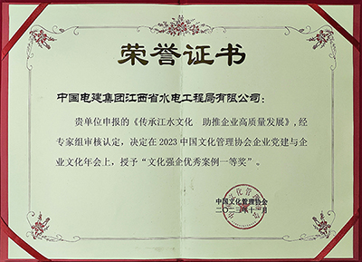 中國電力網(wǎng)訊 (通訊員 趙勇) 日前,2023中國文化管理協(xié)會企業(yè)黨建與企業(yè)文化年會在杭州舉辦。中國電建集團(tuán)江西省水電工程局有限公司(以下簡稱“江西水電”)申報(bào)的《傳承江水文化 助推企業(yè)高質(zhì)量發(fā)展》案例獲評中國文化管理協(xié)會“文化強(qiáng)企優(yōu)秀案例一等獎”,申報(bào)的《企業(yè)文化手冊》獲評“最美品牌之聲”銀獎代言作品。這是繼獲評全國工程建設(shè)行業(yè)企業(yè)文化最佳案例之后,又一次獲獎。