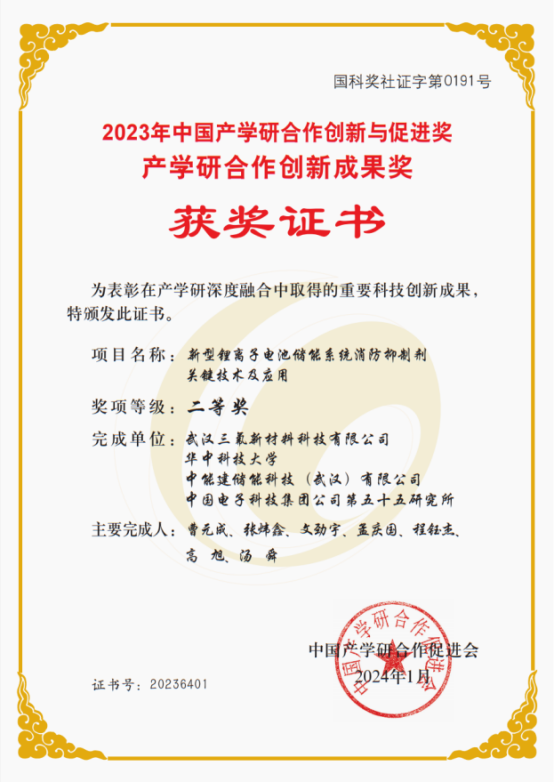 近日,第十五屆中國產(chǎn)學(xué)研合作創(chuàng)新大會(huì)在北京舉行。中能建儲(chǔ)能科技(武漢)有限公司與武漢三氟新材料科技有限公司、華中科技大學(xué)、中國電子科技集團(tuán)公司第五十五研究所等單位合作的“新型鋰離子電池儲(chǔ)能系統(tǒng)消防抑制劑關(guān)鍵技術(shù)及應(yīng)用”榮獲2023年中國產(chǎn)學(xué)研合作創(chuàng)新與促進(jìn)獎(jiǎng)–產(chǎn)學(xué)研合作創(chuàng)新成果獎(jiǎng)二等獎(jiǎng)。