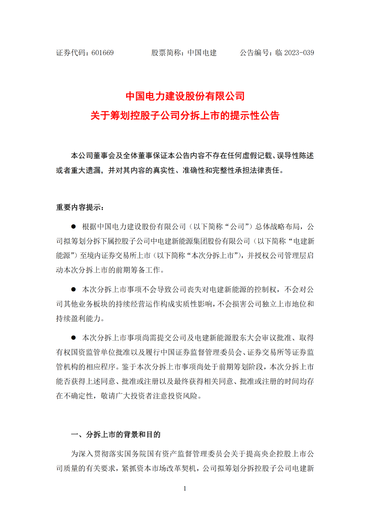 6月2日晚間,中國(guó)電力建設(shè)股份有限公司發(fā)布《關(guān)于籌劃控股子公司分拆上市的提示性公告》,擬將旗下中電建新能源集團(tuán)股份有限公司拆分至境內(nèi)上市,中國(guó)電建以新能源為核心的戰(zhàn)略轉(zhuǎn)型升級(jí)進(jìn)程,邁出了最關(guān)鍵一步。