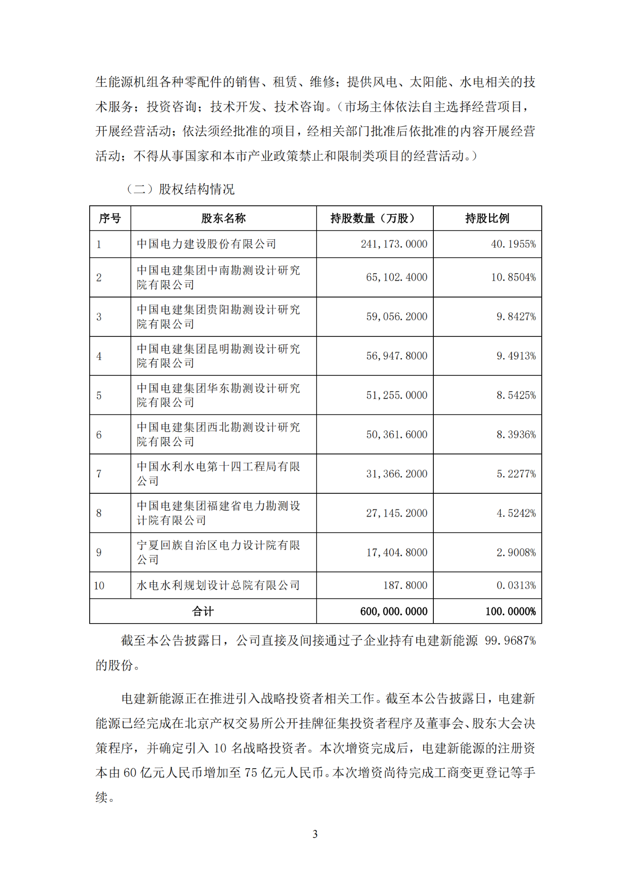 目前,電建新能源正在推進(jìn)引入戰(zhàn)略投資者相關(guān)工作。截至本公告披露日,電建新能源已經(jīng)完成在北京產(chǎn)權(quán)交易所公開掛牌征集投資者程序及董事會(huì)、股東大會(huì)決策程序,并確定引入10名戰(zhàn)略投資者。本次增資完成后,電建新能源的注冊(cè)資本由60億元人民幣增加至75億元人民幣。