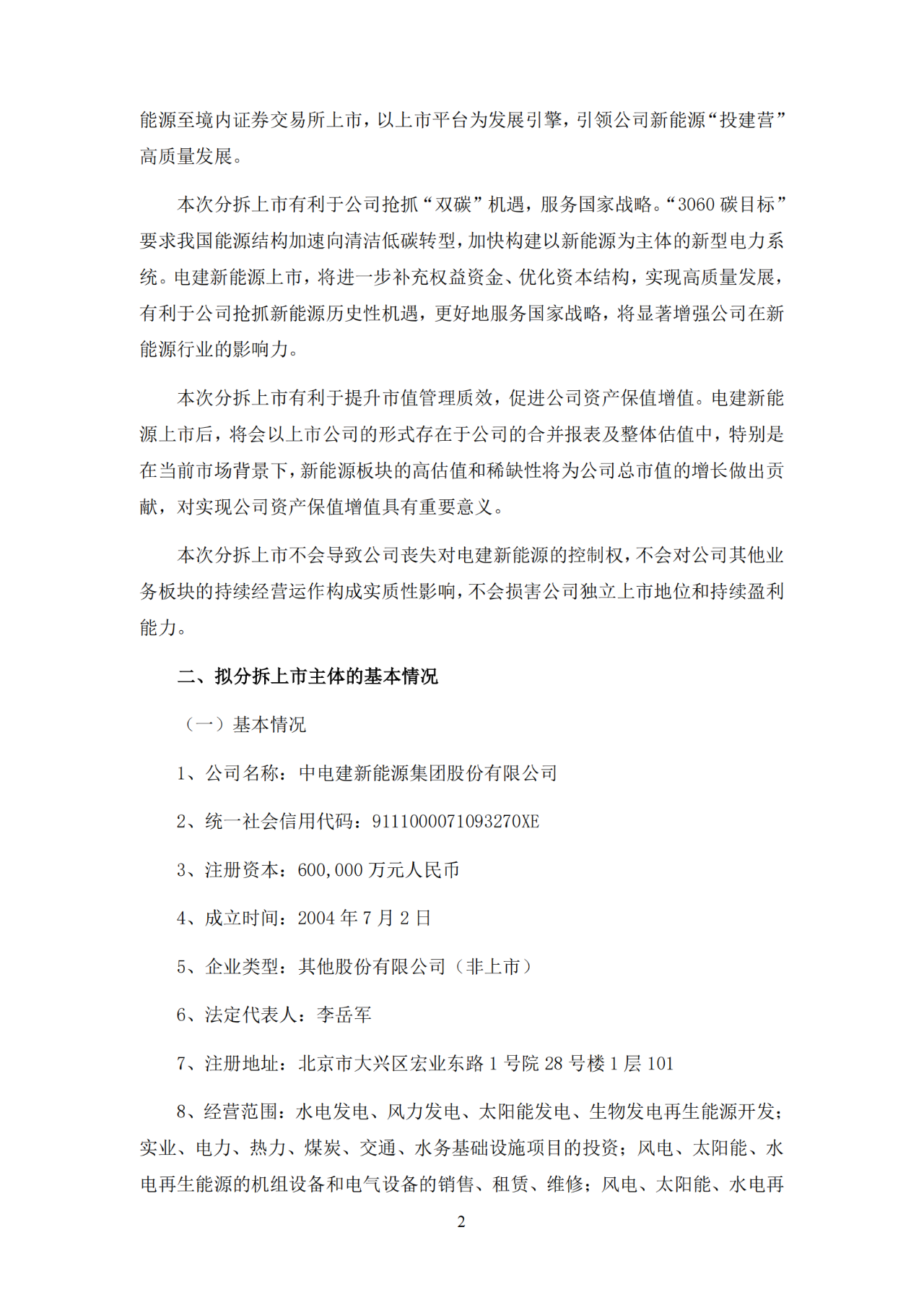 中國(guó)電建對(duì)于本次分拆上市表示,有利于公司搶抓“雙碳”機(jī)遇,服務(wù)國(guó)家戰(zhàn)略。“3060碳目標(biāo)”要求我國(guó)能源結(jié)構(gòu)加速向清潔低碳轉(zhuǎn)型,加快構(gòu)建以新能源為主體的新型電力系統(tǒng)。電建新能源上市,將進(jìn)一步補(bǔ)充權(quán)益資金、優(yōu)化資本結(jié)構(gòu),實(shí)現(xiàn)高質(zhì)量發(fā)展,有利于公司搶抓新能源歷史性機(jī)遇,更好地服務(wù)國(guó)家戰(zhàn)略,將顯著增強(qiáng)公司在新能源行業(yè)的影響力。