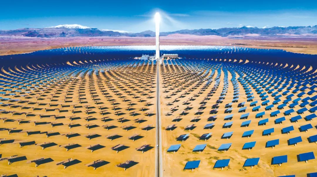 中國電建建設(shè)完成的全球裝機(jī)容量最大的塔式太陽能聚熱電站——摩洛哥努奧Ⅲ期150兆瓦光熱電站。