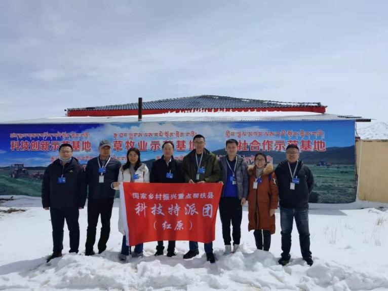 圖:紅原科技特派團在塘日村牦牛養(yǎng)殖合作社前合影