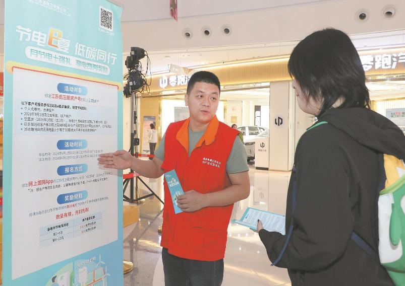江蘇淮安供電公司員工在大型商場(chǎng)宣傳智能空調(diào)主動(dòng)節(jié)電活動(dòng)。王佳慧 攝