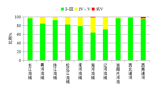 西北諸河、浙閩片河流、長(zhǎng)江流域、西南諸河和珠江流域水質(zhì)為優(yōu),黃河、松花江和淮河流域水質(zhì)良好,遼河和海河流域?yàn)檩p度污染。