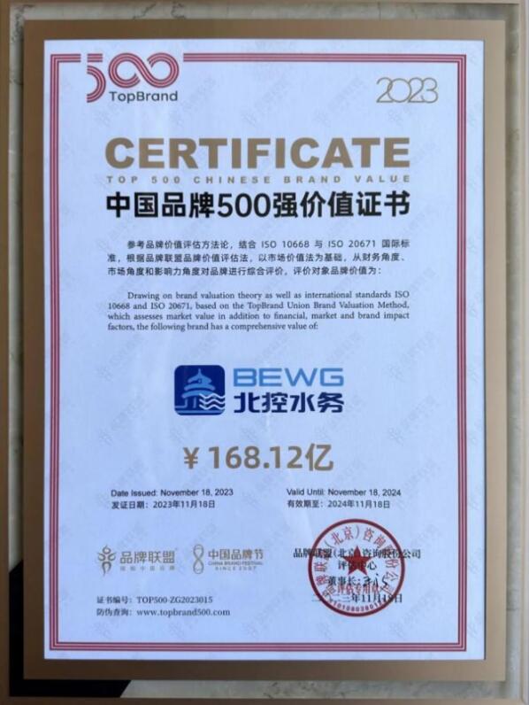 11月18日,2023第十七屆中國品牌節(jié)在杭州舉行。品牌聯(lián)盟(Topbrand Union)發(fā)布了《TopBrand 2023 中國品牌500強(qiáng)》榜單。北控水務(wù)獲中國品牌500強(qiáng)榮譽(yù)稱號,品牌價值達(dá)到168.12億元,這是北控水務(wù)連續(xù)兩年入選該榜單。