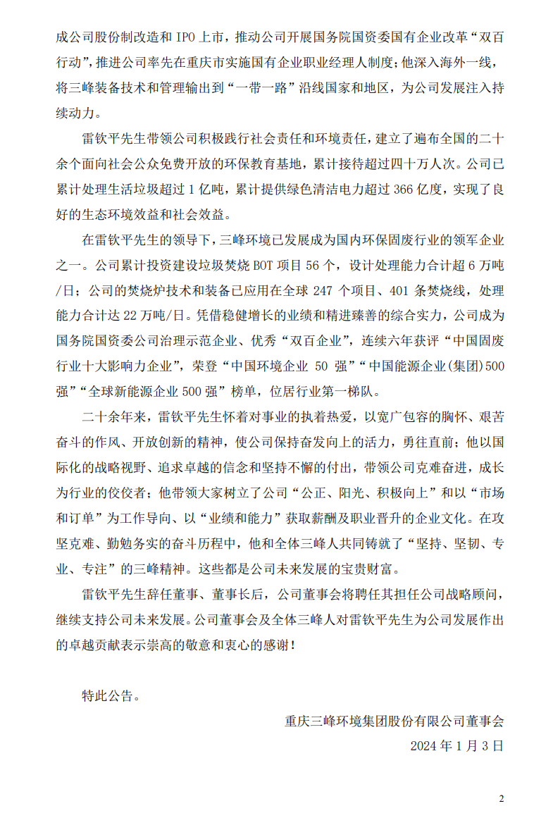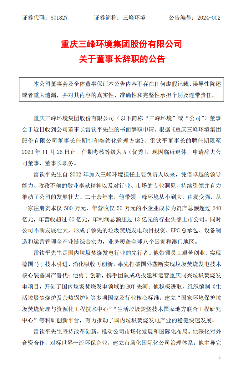 1月3日,三峰環(huán)境發(fā)布公告稱,公司董事會(huì)于近日收到董事長(zhǎng)雷欽平先生的書面辭職申請(qǐng)。根據(jù)《重慶三峰環(huán)境集團(tuán)股份有限公司董事長(zhǎng)任期制和契約化管理方案》,雷欽平董事長(zhǎng)的聘任期限至2023年11月26日止,任期考核等級(jí)為A(優(yōu)秀),現(xiàn)因臨近退休,申請(qǐng)辭去公司董事、董事長(zhǎng)職務(wù)。