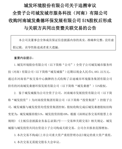 5月10日,城發(fā)環(huán)境公告,為進一步擴大省內環(huán)衛(wèi)產業(yè)市場份額,同時減少同業(yè)競爭,公司全資子公司城發(fā)城服近期以現金人民幣4483.22萬元,通過在河南省產權交易中心摘牌的方式收購了啟迪城市環(huán)境服務集團有限公司持有的河南城發(fā)桑德環(huán)保發(fā)展有限公司51%股權。
