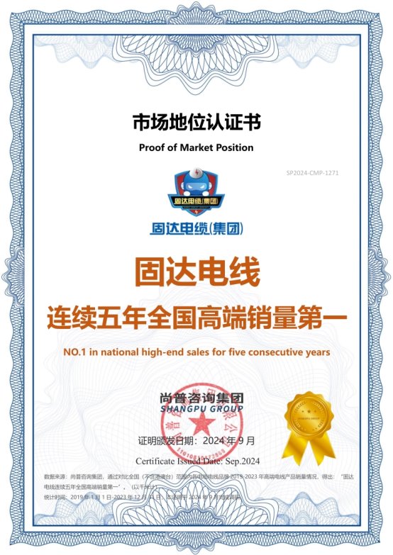市場(chǎng)地位認(rèn)證:固達(dá)電線連續(xù)五年全國(guó)高端銷量第一