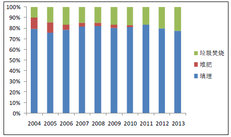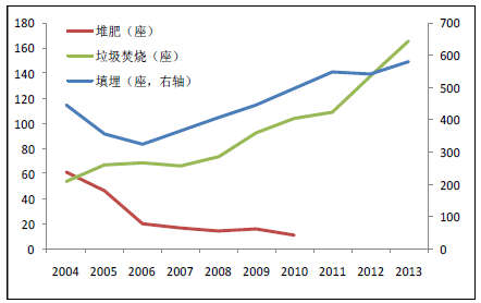 垃圾焚燒可以快速處理堆積成山的垃圾,有效減小垃圾的體積50%-90%,同時通過焚燒發(fā)電, 既解決了垃圾填埋的占地、污染問題,又實現了能源的清潔回收利用。目前,我國城市生活垃圾累積堆存量已達70 億噸,據國家統計局數據顯示,截止2013 年我國生活垃圾填埋比例占68.2%, 垃圾焚燒僅占30.1%。