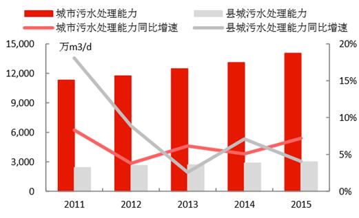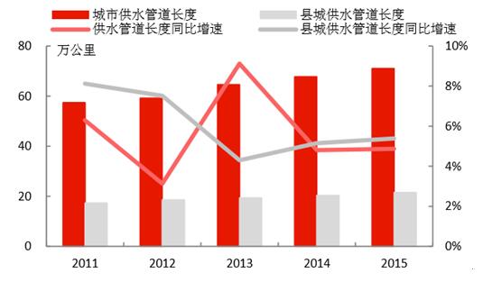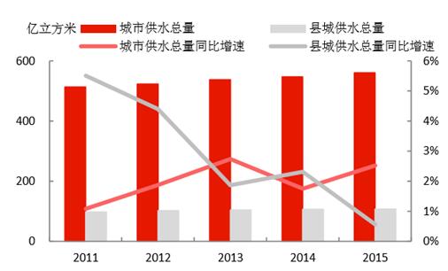 城鎮(zhèn)化的推進(jìn),為水務(wù)行業(yè)持續(xù)帶來(lái)增量空間。1)我國(guó)城鎮(zhèn)人口2015年達(dá)到7.71億,近年城鎮(zhèn)人口增速維持在3%左右;城市建成區(qū)面積2015年達(dá)到5.21萬(wàn)平方公里,近年面積增速維持在4-5%。2)城市供水總量在2015年達(dá)到561億立方米,同比增速為2.5%;縣城的供水量達(dá)106.9億立方米,增速有所下降,僅為0.56%。3)城市供水管網(wǎng)長(zhǎng)度在2015年達(dá)到71.0萬(wàn)公里,同比增速為4.87%;縣城的供水管網(wǎng)長(zhǎng)度為21.5萬(wàn)公里,同比增速達(dá)5.39%;通過(guò)管網(wǎng)建設(shè),是的用水普及率持續(xù)提升,城市和縣城2015年的用水普及率分別為98.1%和90.0%。4)城市污水處理能力在2015年達(dá)到1.40億立方米/日,同比增長(zhǎng)7.19%;縣城達(dá)到2999萬(wàn)立方米/日,同比增長(zhǎng)了4.06%,城市和縣城的污水處理率分別達(dá)到91.9%和85.2%,較2010年分別提升了9.6和25.1個(gè)百分點(diǎn)。