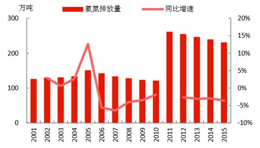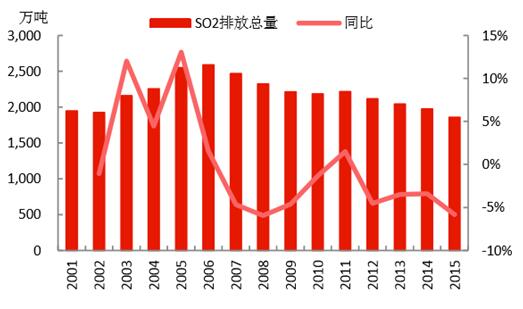 經(jīng)過(guò)“十二五”的治理,四項(xiàng)污染物減排約束性指標(biāo)均實(shí)現(xiàn)了持續(xù)下降,完成了“十二五”的減排任務(wù),取得了一定的環(huán)保成果。2015年:1)COD的排放量為2224萬(wàn)噸,且每年以3%左右的速度下降;2)氨氮的排放量為230萬(wàn)噸,且每年以3%左右的速度下降;3)SO2的排放量為1859萬(wàn)噸,每年基本以4%左右的速度下降,而收關(guān)年2015年下降速度高達(dá)5.84%;4)NOx的排放量為1852萬(wàn)噸,“十二五”剛開(kāi)始治理,當(dāng)前的下降速度還處于上升趨勢(shì),收關(guān)年2015年下降速度高達(dá)10.89%。
