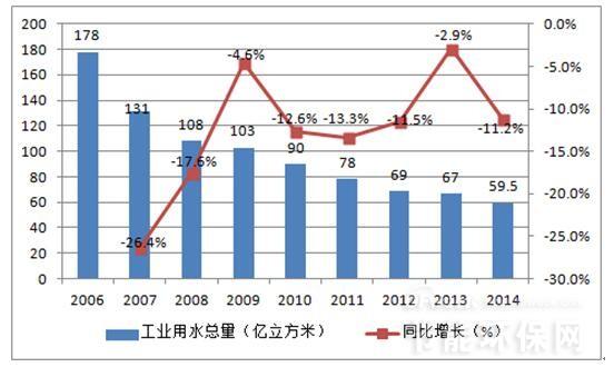 在我國工業(yè)企業(yè)用水效率不高,導致我國工業(yè)企業(yè)用水量大,工業(yè)廢水排放多,迚一步加劇了我國水資源短缺的困境。根據(jù)水利部的統(tǒng)計,盡管我國萬元工業(yè)增加值用水量呈現(xiàn)出不斷下降的趨勢,2014 年萬元工業(yè)增加值用水量59.5 立方米(當年價),按可比價計算比2010 年下降32%。但與發(fā)達國家相比我國萬元工業(yè)增加值用水量較大,工業(yè)企業(yè)用水效率有待迚一步提高。在水資源緊缺的背景下,提高工業(yè)用水效率,降低工業(yè)對水資源過量消耗成為生態(tài)文明建設的必然要求,近期出臺的水十條明確提出,提高用水效率,到2020 年全國萬元工業(yè)增加值用水量比2013 年下降30%以上;抓好工業(yè)節(jié)水制定國家鼓勵和淘汰的用水技術(shù)、工藝、產(chǎn)品和設備目彔,完善高耗水行業(yè)取用水定額標準。我們認為中水回用和廢水零排放成為工業(yè)廢水處理的下一個主攻方向,相關企業(yè)發(fā)展前景廣闊。