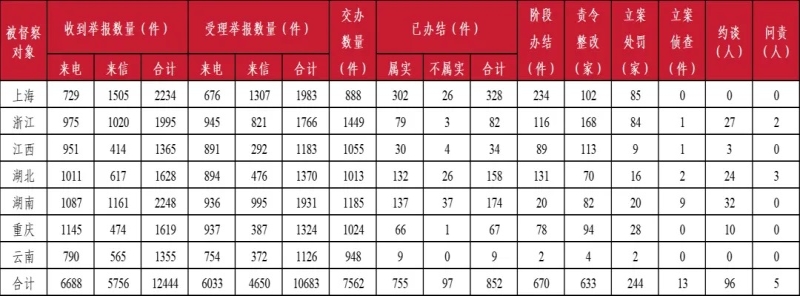 截至5月20日晚20:00,各督察組共收到群眾來(lái)電、來(lái)信舉報(bào)12444件,受理有效舉報(bào)10683件,經(jīng)梳理合并重復(fù)舉報(bào),累計(jì)向被督察地方轉(zhuǎn)辦7562件;被督察地方已辦結(jié)或階段辦結(jié)1522件,其中立案處罰244家;立案?jìng)刹?3件;約談黨政領(lǐng)導(dǎo)干部96人,問(wèn)責(zé)黨政領(lǐng)導(dǎo)干部5人。