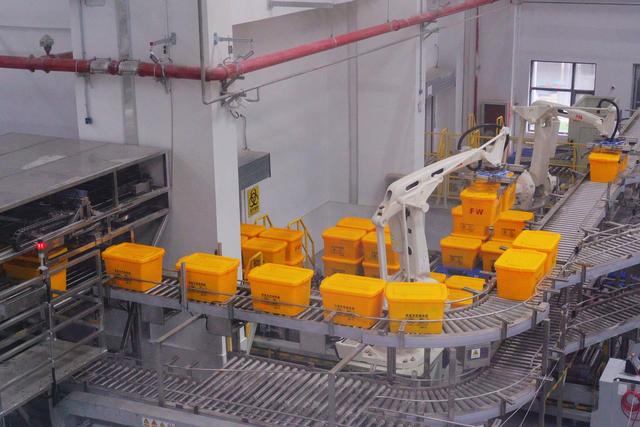 當(dāng)一輛裝載著醫(yī)療廢物的運輸車進入廠區(qū)后,車廂門一打開,負責(zé)卸貨的機械臂便迅速啟動,通過自身配備的攝像頭對周轉(zhuǎn)箱進行拍照識別并完成自動抓取,裝有醫(yī)療廢物的黃色周轉(zhuǎn)箱隨即被放置于輸送線上。為了保證各個環(huán)節(jié)的無縫對接,園區(qū)特別定制了24000個固定尺寸的周轉(zhuǎn)箱,確保從收集、運輸?shù)教幚淼娜^程順利進行。