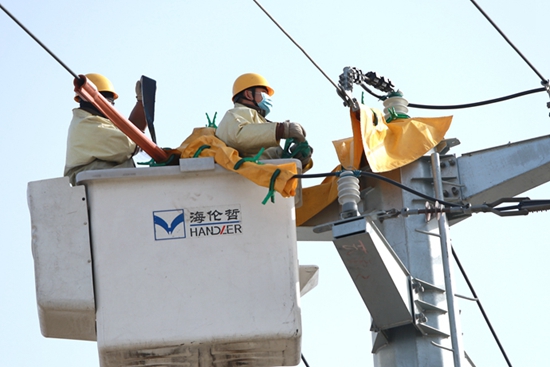 中國電力網(wǎng)訊 1月12日,在濰坊壽光市田柳鎮(zhèn)朱家村,國網(wǎng)壽光市供電公司帶電作業(yè)人員對(duì)10千伏后疃線127號(hào)桿加裝絕緣護(hù)套,同時(shí)對(duì)裸露部分進(jìn)行絕緣化封包處理,及時(shí)消除線路運(yùn)行隱患,保障電網(wǎng)迎峰度冬期間安全可靠運(yùn)行。
