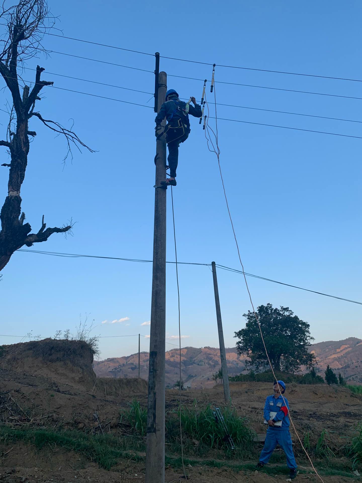 經過作業(yè)人員七小時緊張作業(yè),成功將10千伏大河口線新村支線1.6A號、1.7A號桿隱患消除。運維班工作人員還沒來得及坐下來歇息一會兒,便馬上動身趕往了復電現(xiàn)場。