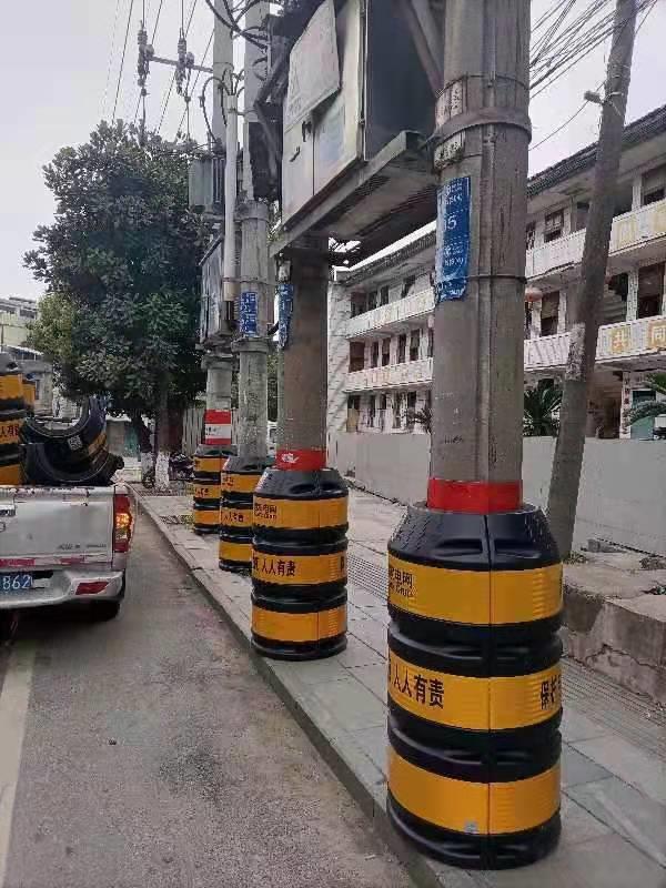 此次安裝的電桿防撞桶顏色為黃黑相間,格外醒目,上面印有國(guó)家電網(wǎng)標(biāo)志,中間印有警示標(biāo)語。防撞桶為塑料材質(zhì),外貼有反光條,具有緩沖撞擊力、夜間反光警示等功能,能有效提醒行人和車輛注意安全,極大地降低了電桿因外力因素而導(dǎo)致的破壞,確保電網(wǎng)安全可靠供電的同時(shí),保障客戶用電安全。