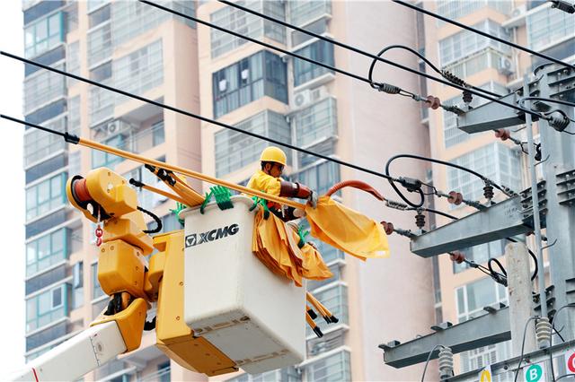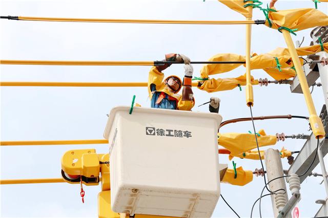 國網(wǎng)利辛縣供電公司帶電作業(yè)員工正在進行帶電懸空搭火工作。劉喆攝