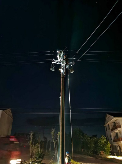 事故發(fā)生后,龔坊供電所所長楊程立即組織人員第一時間趕赴現(xiàn)場,經(jīng)現(xiàn)場查勘后制定搶修方案,在確保人身安全的前提下,連夜開展搶修工作。在搶修現(xiàn)場,做好安全措施后,樂安縣供電公司龔坊供電所10余名員工協(xié)同合作,對損毀的斷桿、導線、橫擔進行清理,重新立桿、安裝新的拉線、T接導線……搶修工作有條不紊的進行。