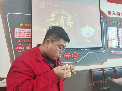 緊接著,趣味小游戲的開始又將整場活動掀起另一個(gè)高潮。為冬奧會吉祥物“冰墩敦”貼眼睛,展現(xiàn)了職工團(tuán)隊(duì)協(xié)作能力;“扮時(shí)鐘”體現(xiàn)了職工對時(shí)間觀念的認(rèn)知;最后的“聲聲報(bào)福”展現(xiàn)了職工的配合默契程度。歡聲笑語過后,大家每人一碗熱乎乎湯圓,寓意著“團(tuán)團(tuán)圓圓”,同時(shí)也祝愿全體職工在新的一年里能夠更加團(tuán)結(jié)奮進(jìn),砥礪前行。