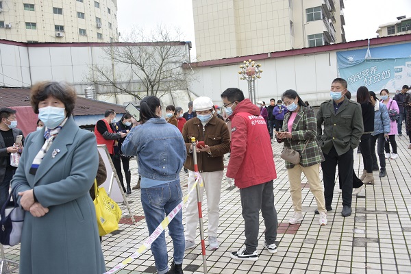26日采樣當(dāng)天,該公司工作人員分為兩隊(duì),其中一隊(duì)40余人分為4組,在中興小區(qū)開展“敲門行動(dòng)”,挨家挨戶上門登記核對(duì)人員名冊(cè),對(duì)于不會(huì)使用手機(jī)的人員則進(jìn)行一對(duì)一指導(dǎo),幫助他們快速進(jìn)行預(yù)約登記,并將不便出門人員一一登記造冊(cè),全面掃描、不漏盲區(qū)。另一隊(duì)20余人則留在采樣現(xiàn)場(chǎng),測(cè)溫、引導(dǎo)、信息登記、分發(fā)物資、環(huán)境消殺,各司其職,采樣現(xiàn)場(chǎng)秩序井然。對(duì)于不便出門的特殊人員,志愿者帶領(lǐng)醫(yī)護(hù)人員進(jìn)行上門采樣檢測(cè),確保責(zé)任小區(qū)471戶應(yīng)檢盡檢、不漏一戶、不漏一人。采樣結(jié)束后,志愿者還對(duì)采樣點(diǎn)全場(chǎng)地進(jìn)行消殺。