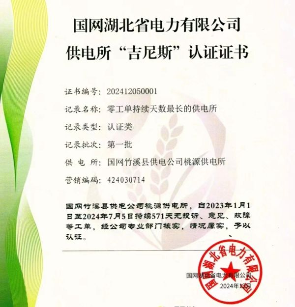 中國電力網(wǎng)訊(通訊員 黃耀成、郭旭) 日前,從國網(wǎng)湖北省電力有限公司傳來喜訊,繼去年國網(wǎng)竹溪縣供電公司匯灣供電所喜獲國網(wǎng)十堰供電公司“四星級鄉(xiāng)鎮(zhèn)供電所”授牌后,今年國網(wǎng)竹溪縣供電公司桃源供電所又獲國網(wǎng)湖北省電力有限公司頒發(fā)的零工單位持續(xù)天數(shù)最長的供電所“吉尼斯”認(rèn)證證書,這是該公司強(qiáng)化從業(yè)紀(jì)律,擦亮服務(wù)窗口,電業(yè)清風(fēng)為民的真實寫照。
