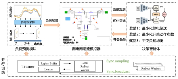 國網(wǎng)浙江省電力有限公司紹興供電公司聚焦清潔能源消納優(yōu)化控制和負(fù)載均衡目標(biāo),聯(lián)合浙江思極和阿里云等公司一起訓(xùn)練電力調(diào)度人工智能導(dǎo)航員——“調(diào)度智能體”。采用阿里云“云邊一體”數(shù)字化基礎(chǔ)設(shè)施和強(qiáng)化學(xué)習(xí)AI 核心產(chǎn)品,結(jié)合源網(wǎng)荷儲示范工程,從“網(wǎng)”的適應(yīng)性角度提出新能源消納通道靈活調(diào)節(jié)的思路,采用分布式近端策略優(yōu)化(PPO)為核心算法,通過預(yù)測抽樣+潮流仿真+強(qiáng)化學(xué)習(xí)訓(xùn)練迭代,生成地區(qū)主、配網(wǎng)方式調(diào)節(jié)策略,實(shí)現(xiàn)示范區(qū)域內(nèi)電網(wǎng)運(yùn)行方式面向新能源消納的自適應(yīng)調(diào)節(jié)。