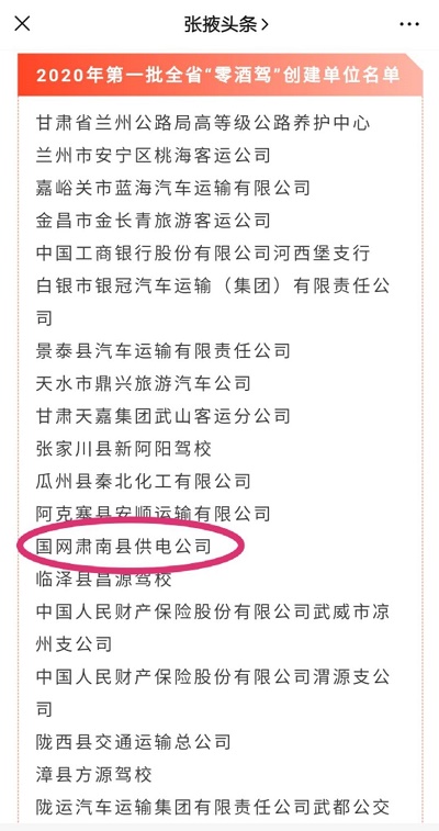 中國電力網(wǎng)訊 近日,從甘肅省公安廳交通警察總隊(duì)發(fā)出的《2020年第一批全省“零酒駕”創(chuàng)建單位公告》上獲悉,國網(wǎng)張掖肅南縣供電公司榮獲“2020年第一批全省“零酒駕”創(chuàng)建單位”榮譽(yù)稱號(hào),也是全省國網(wǎng)系統(tǒng)內(nèi)唯一家獲獎(jiǎng)單位。