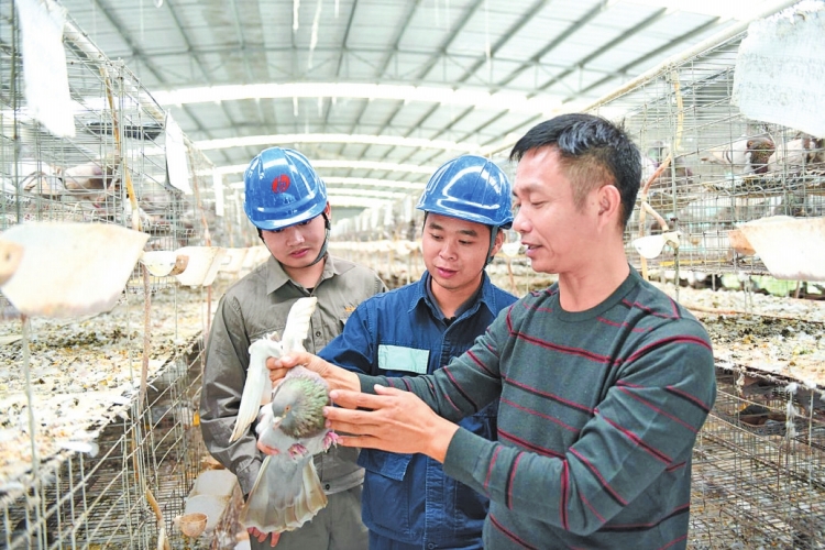 廣西新電力投資集團(tuán)博白縣公司工作人員了解鴿子養(yǎng)殖扶貧車間用電需求。向建軍 攝